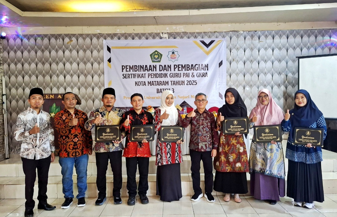 MATARAM – Sebanyak 66 orang guru pendidikan agama Islam dan guru pendidikan anak usia dini Islam Raudhatul Athfal (RA) Kota Mataram lulusan Pendidikan Profesi Guru (PPG) Dalam Jabatan Batch 3 tahun 2025 resmi menerima Sertifikat Pendidik dari Lembaga Pendidikan Tenaga Kependidikan (LPTK) UIN Mataram, Sabtu (7/2/2026).
